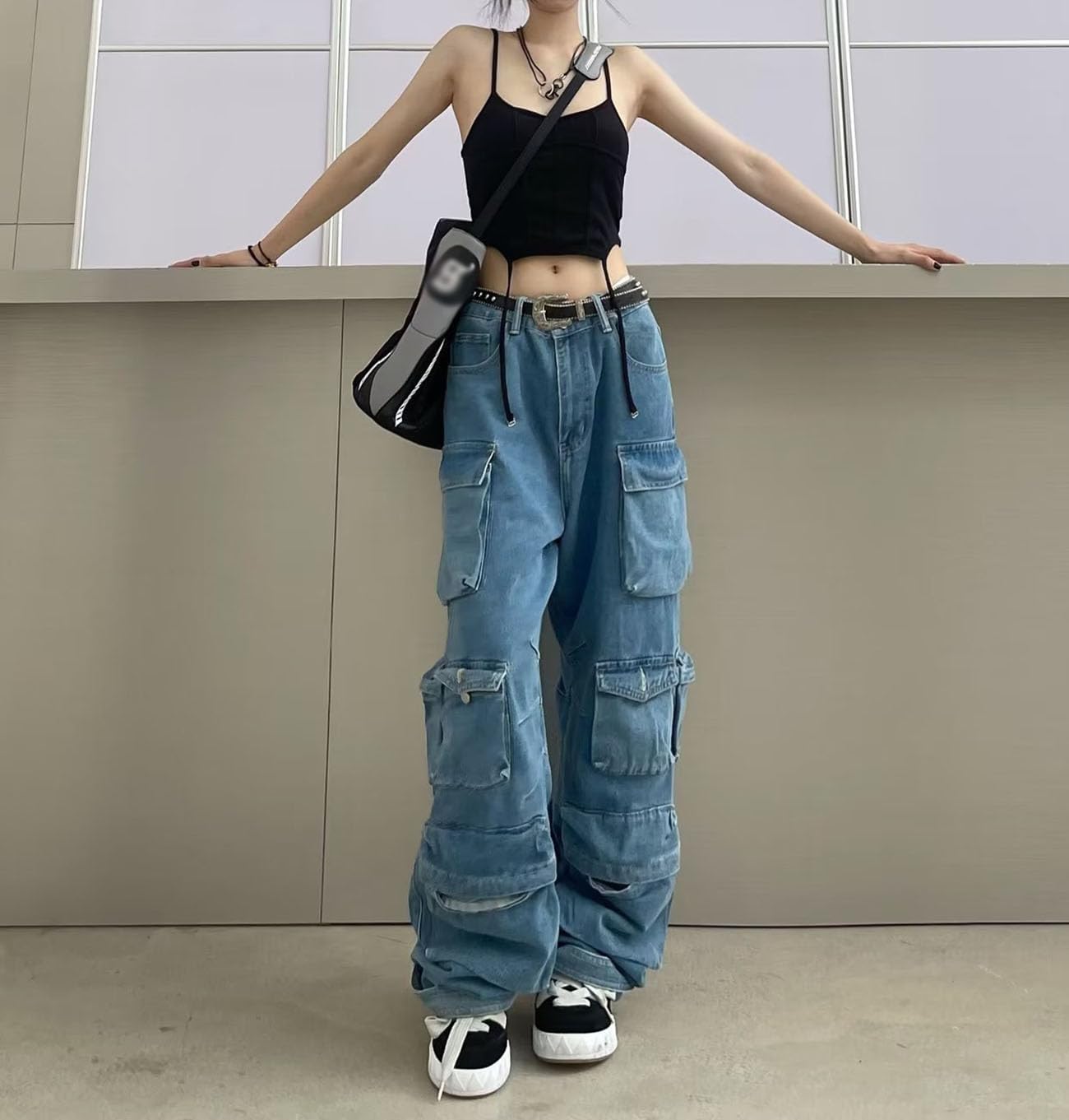 Baggy Cargo Pants for Women Girls Wide Leg Jeans Hip Hop Streetwear Low Rise Oversized Jeans Grunge Clothes Blue